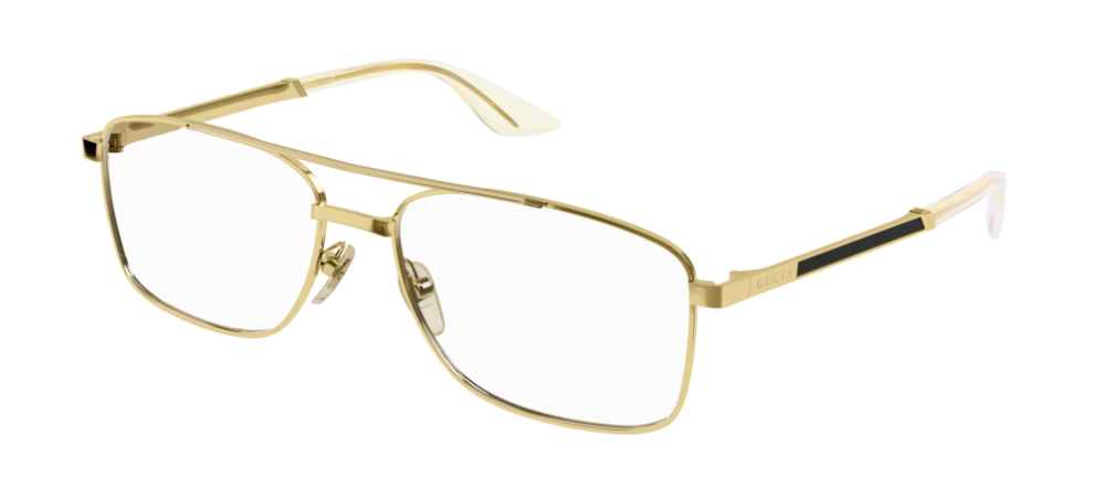 Warm colour palettes and classic metal shapes combined to create timeless masculine silhouettes for an elegant and sophisticated taste.Masculine caravan shape in metal enriched by enamel decoration on temples.Discreet Gucci Lettering logo on temples.The style is available in gold and silver tones; black, yellow and amber enamel is applied to enrich the temples.