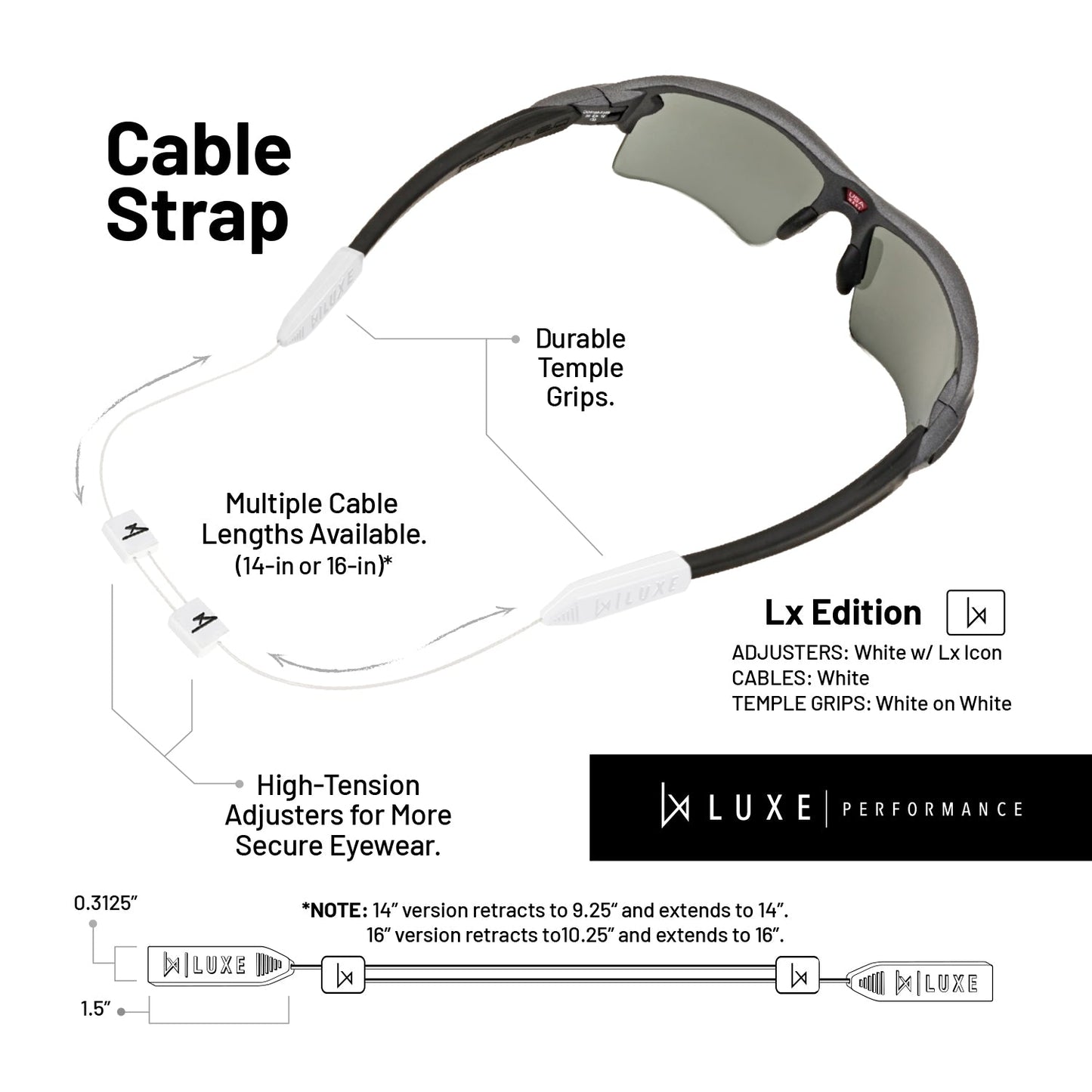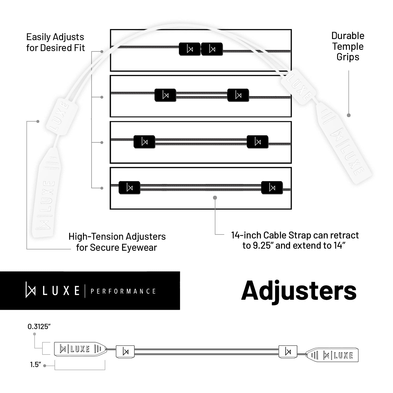 - FIT: Adjustable 14" cable strap to ensure an optimum & secure fit. They fit a variety of sunglasses, reading glasses, and prescription glasses.