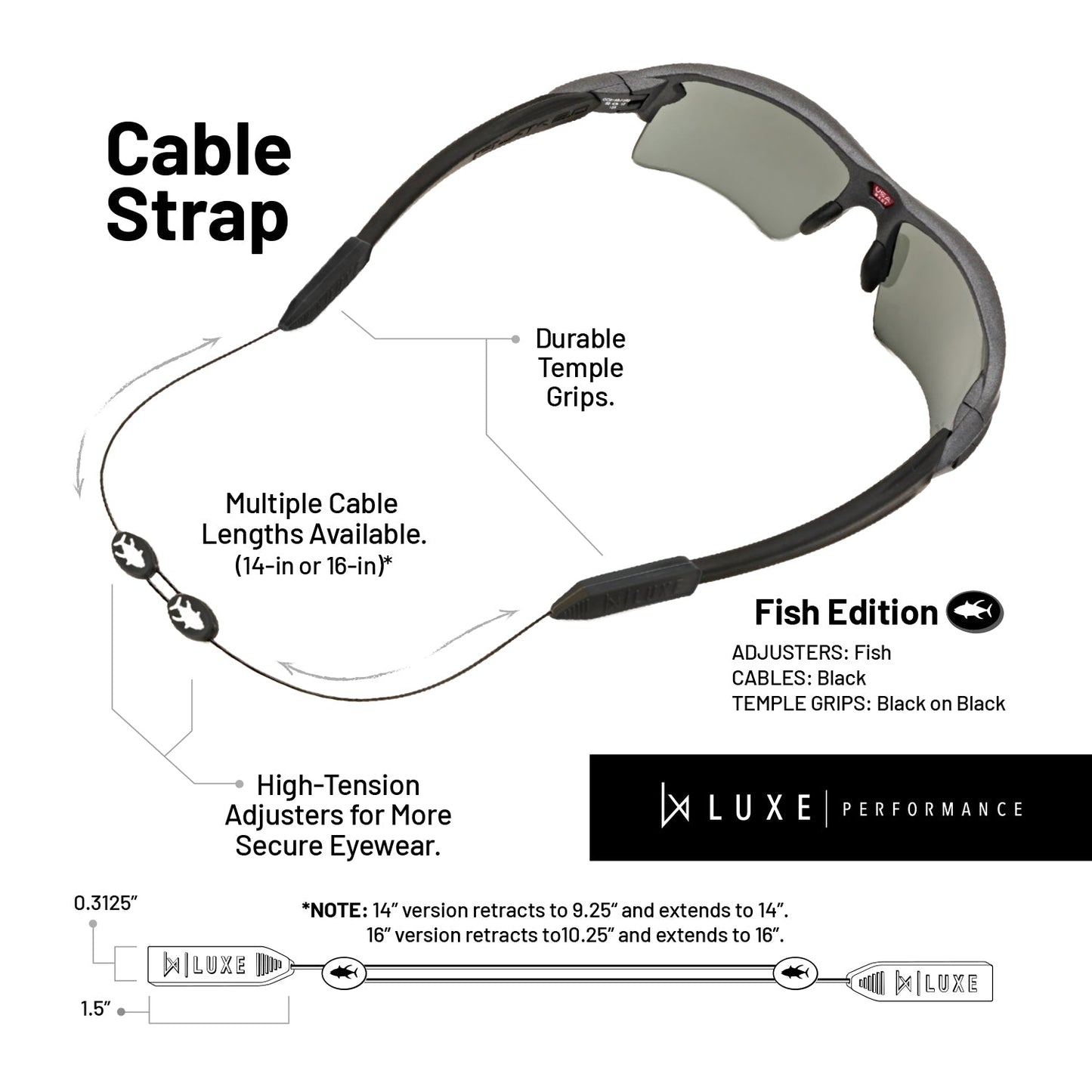 • FIT: Adjustable 14" cable strap to ensure an optimum & secure fit. They fit a variety of sunglasses, reading glasses, and prescription glasses.