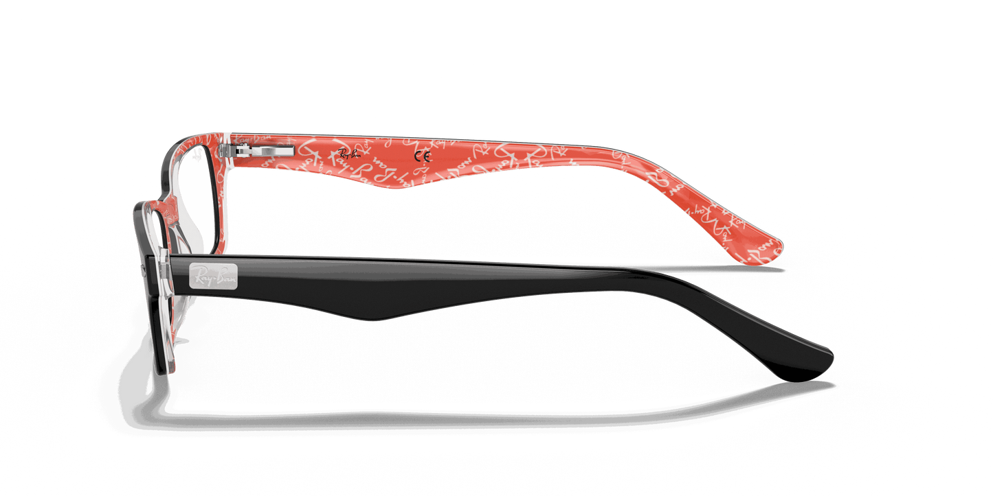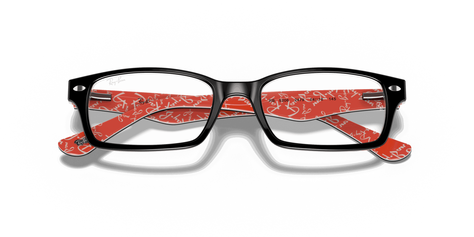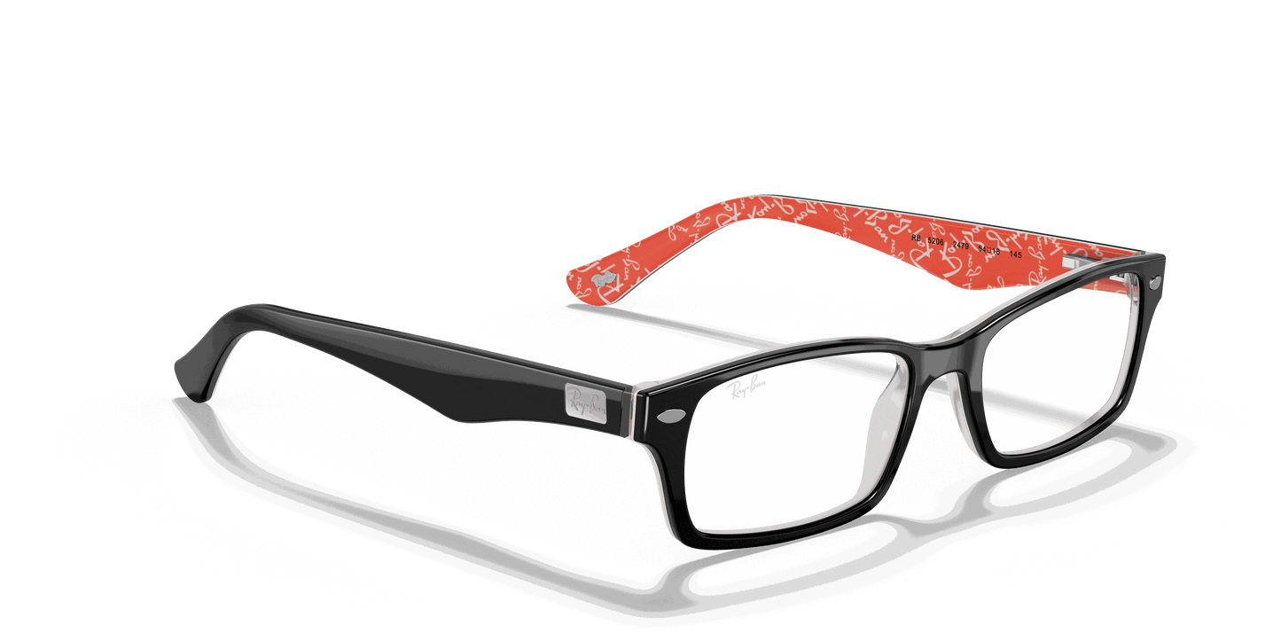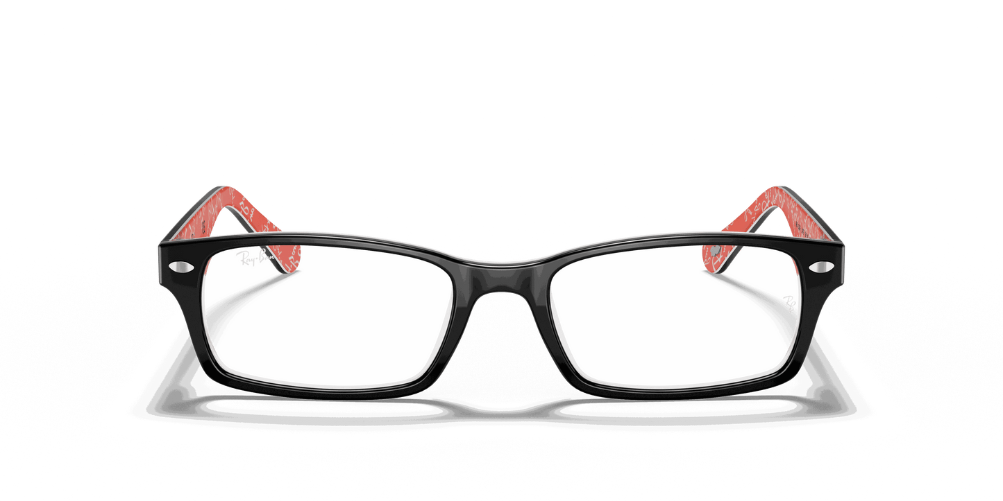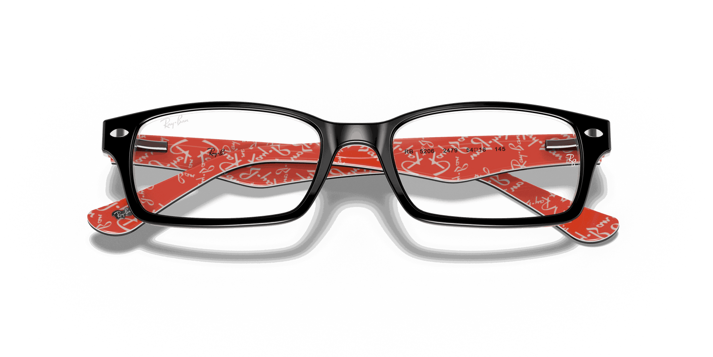 Stay stylish and classy with these Ray-Ban 5206 2479 Black Red Texture eyeglasses. These rectangular eyeglasses come in black acetate with metal decals on the wings. To add to the unique style, the interior arms come in red acetate with Ray-Ban text patterns. They also come with flexible spring hinges to give you the best comfort.