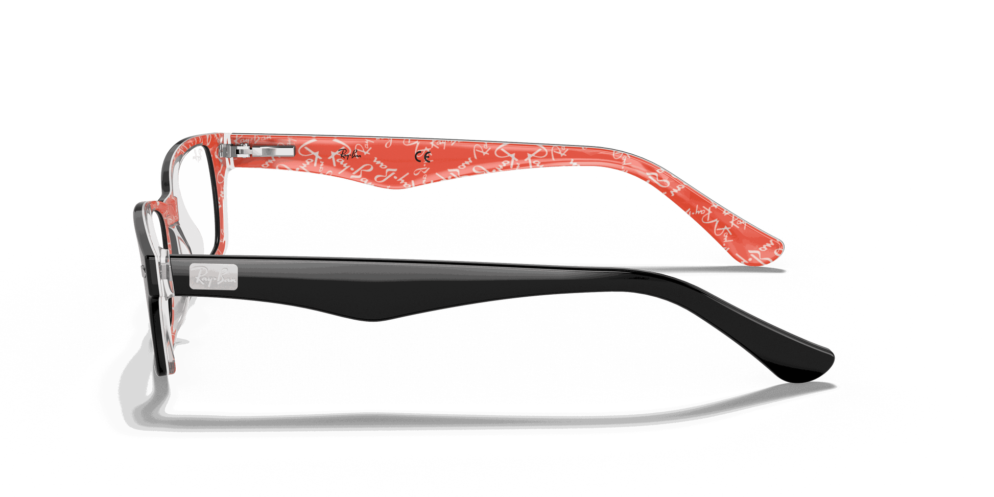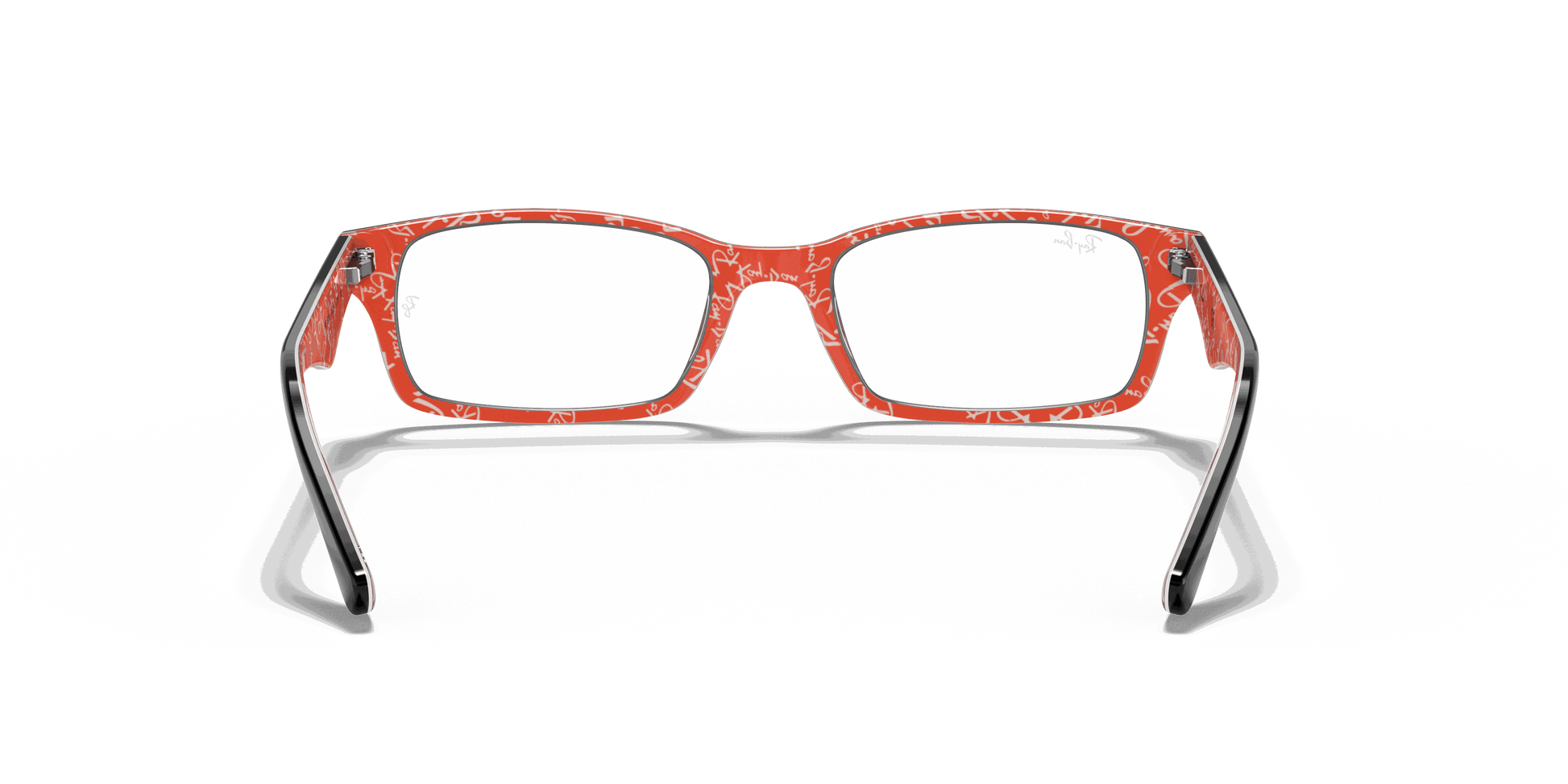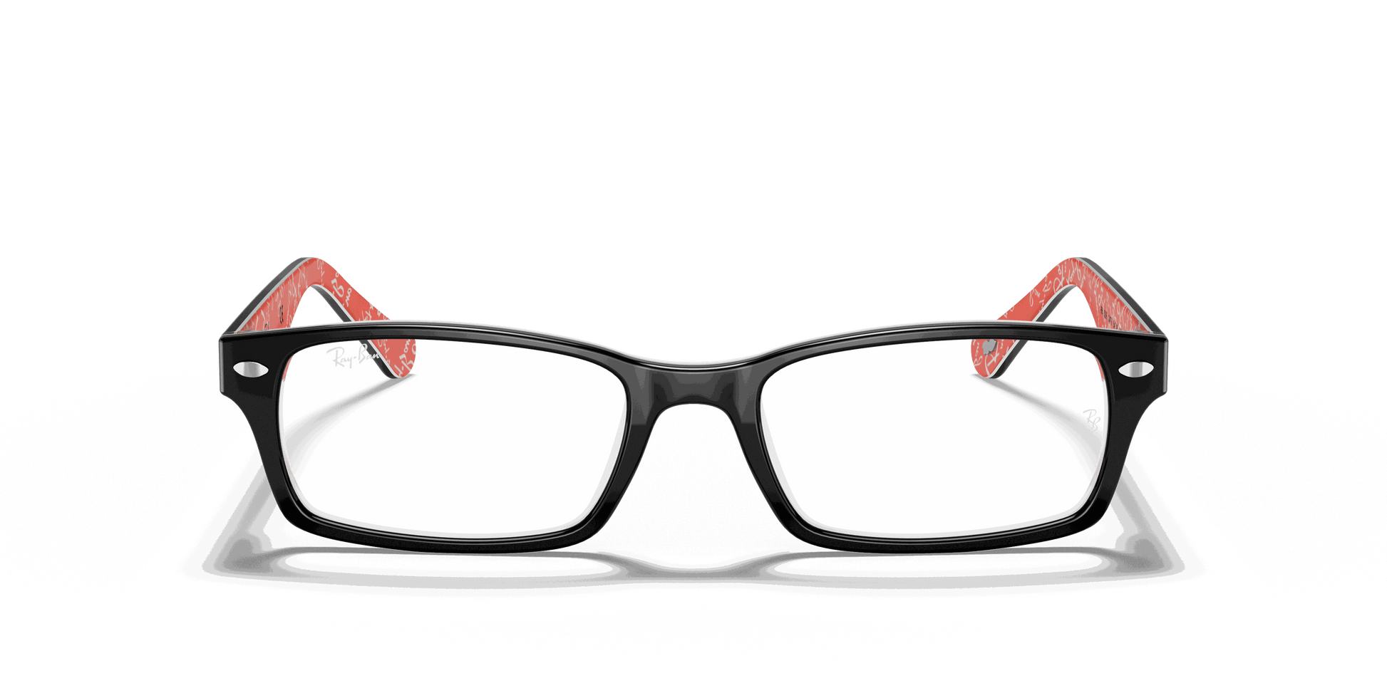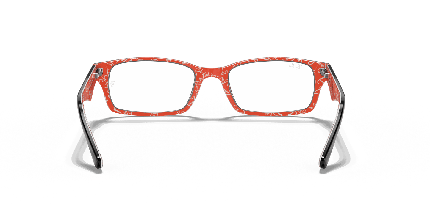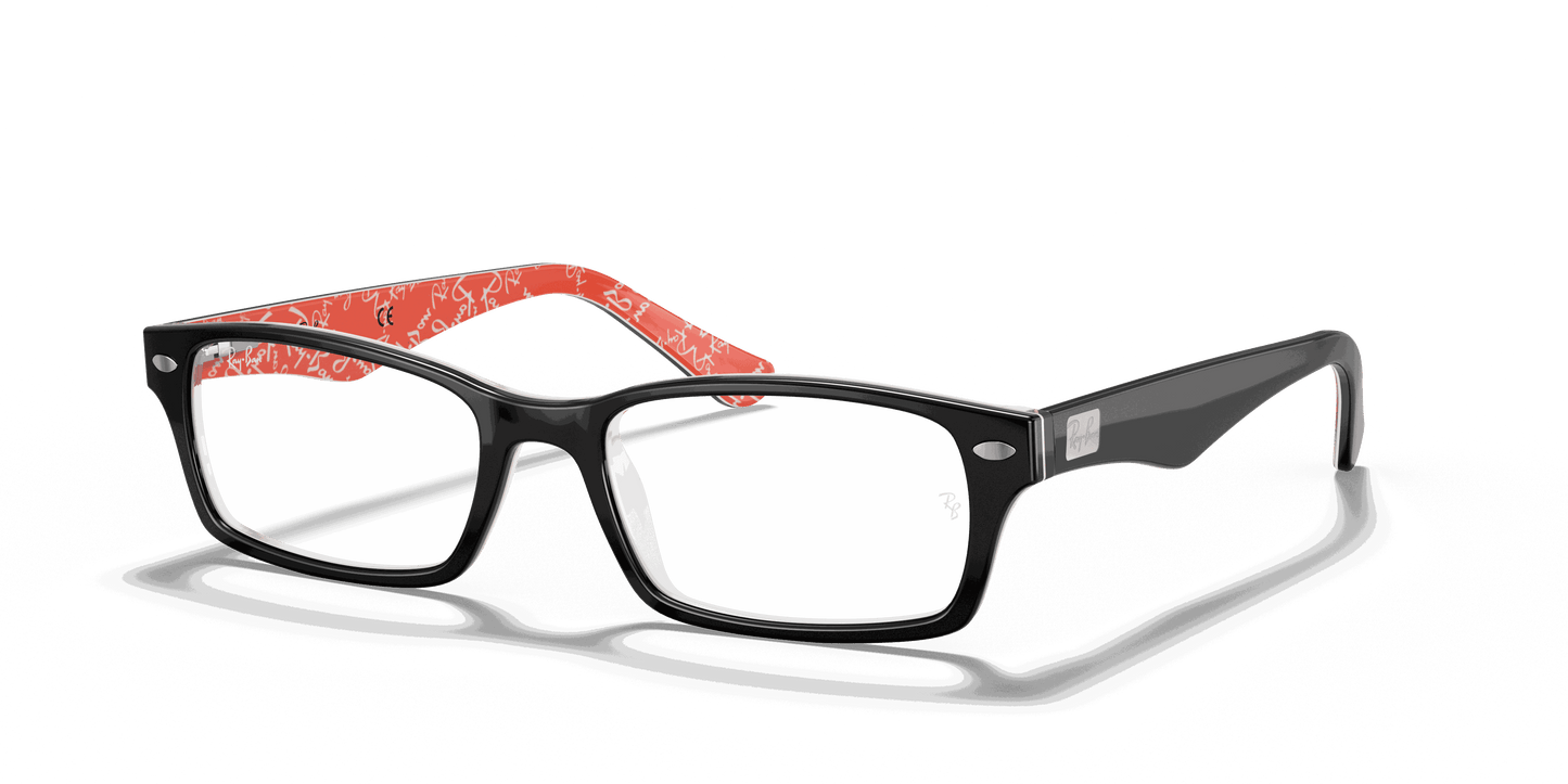 Stay stylish and classy with these Ray-Ban 5206 2479 Black Red Texture eyeglasses. These rectangular eyeglasses come in black acetate with metal decals on the wings. To add to the unique style, the interior arms come in red acetate with Ray-Ban text patterns. They also come with flexible spring hinges to give you the best comfort.